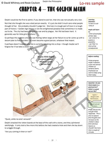 As well as the story book, such as Delphi the Philosopher or Delphi the Dreamer, you will also have a picture slideshow for the chapter which you can display to the children. The best set up is for you to sit next to the screen, which will show the pictures and questions, and have your class in front of you either on the carpet or on chairs.